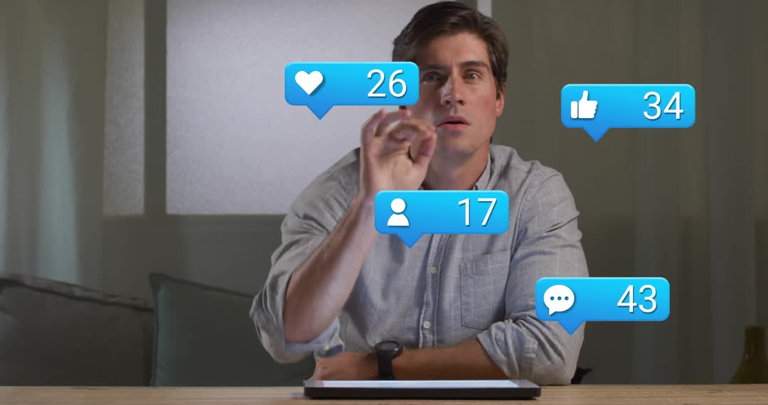 A young man sits at a table, engaging with floating social media icons as part of a digital marketing demonstration. This video visually represents modern digital interaction and social media engagement techniques. Ideal for use in marketing materials, presentations, or articles related to social media strategies, digital business, and communication technologies.