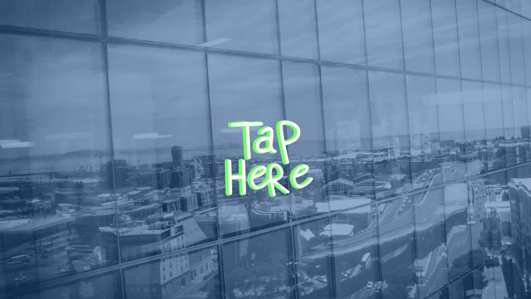 Interactive Tap Here Sign Over Reflective Cityscape Video