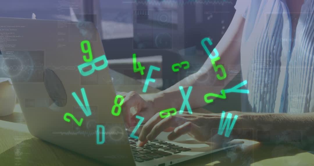 Hands typing on a laptop with overlay of neon numbers and letters suggesting data interaction and processing. Reflects themes of innovation and technology, suitable for visuals related to global business development, technology services, digital interfaces or data-driven solutions.