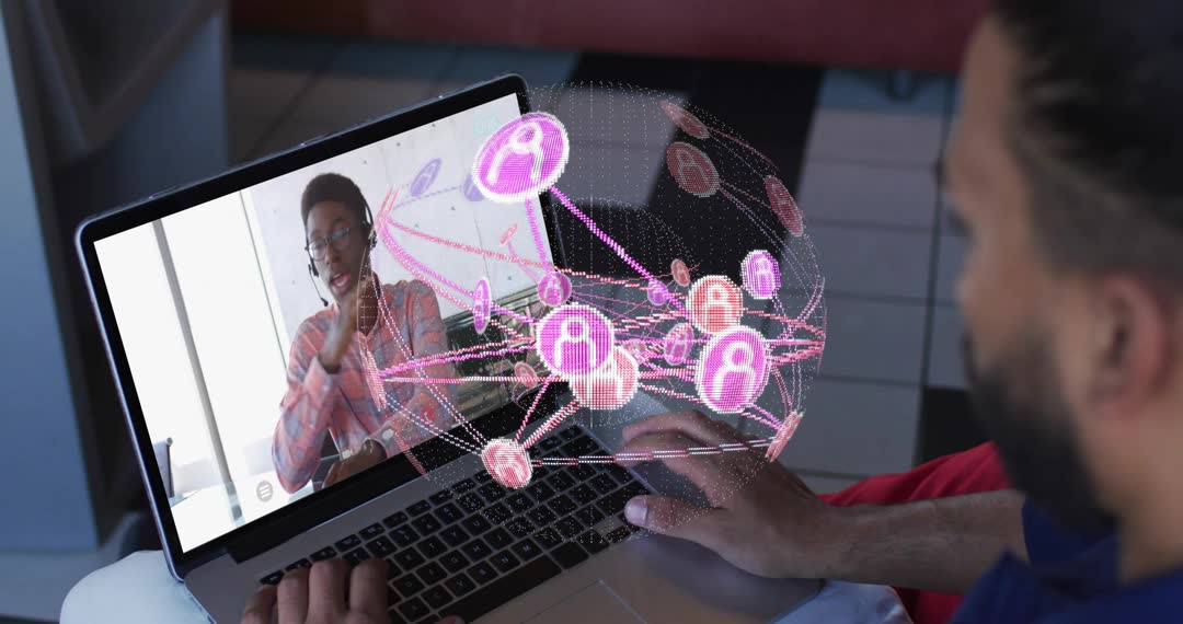 A person uses a computer for a video call session, illustrating cutting-edge tech integration with animations visualized in a holographic format. This dynamic display symbolizes networking and advanced telecommunications, arranging a forward-thinking vision. Ideal for promoting IT services, digital solutions, remote work tools, innovative gadget marketing, corporate collaboration technologies, or futuristic multimedia presentations.