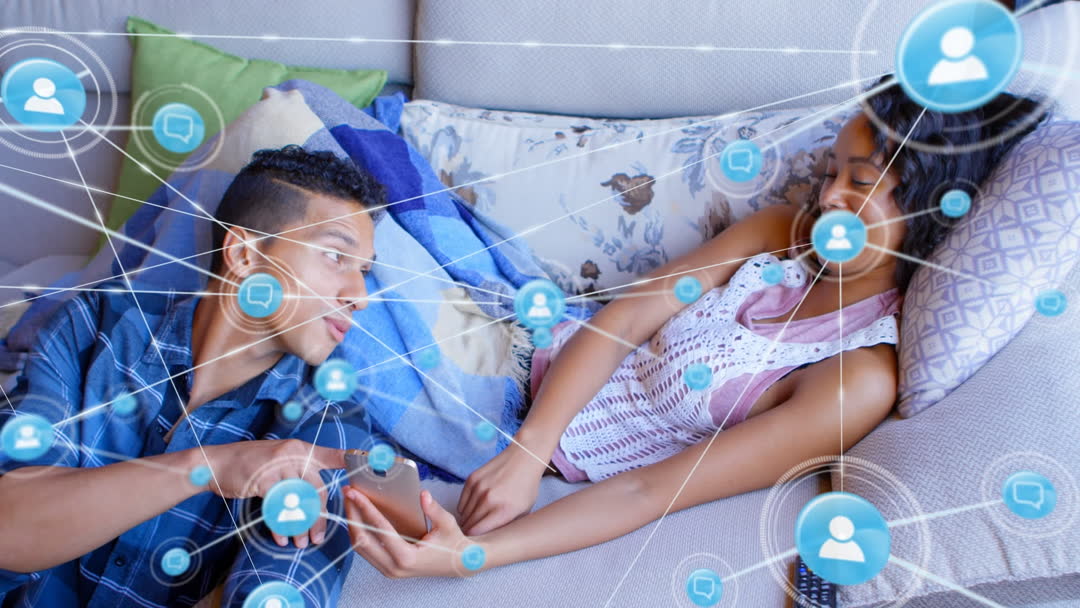 Young couple lying on a couch engaging with social media through a smartphone. Overlay of digital network icons illustrates the concept of online connectivity and communication. Useful for themes about modern lifestyle, technology integration in everyday life, and the impact of social media on relationships.