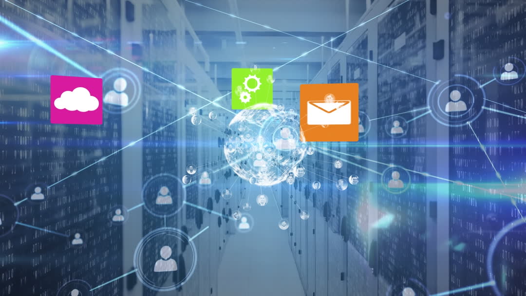 Connecting digital icons and a globe are situated against background of a data center with computer servers. Perfect for illustrating concepts like global connectivity, data processing, and cloud computing. Useful for technology presentations, cybersecurity discussions, and digital transformation material.