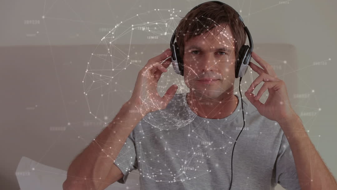 Depicts young adult with headphones, surrounded by digital network graphics representing communication technology and innovation. Ideal for illustrating concepts like global business connectivity, technological advancements, audio technology demonstrations in marketing materials, and digital presentations.