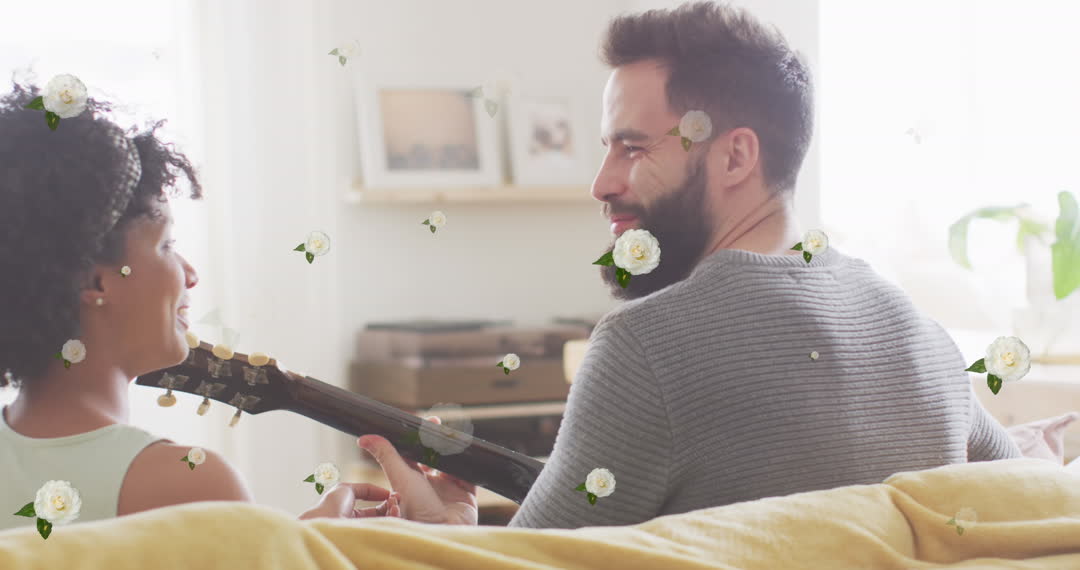 A joyful interracial couple is seen enjoying each other's company while the man plays the guitar, enhanced by a digital floral animation. This video embodies love, creativity, and cultural diversity, set to a cozy home backdrop. Perfect for use in lifestyle blogs, romantic content, marketing materials focusing on relationships, or diverse cultural representations.