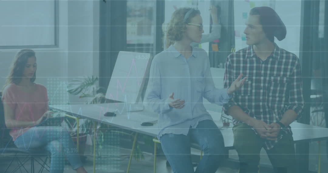 This video depicts a diverse group of colleagues engaged in discussion in an office, blended with digital data visuals, symbolizing collaborative modern workplace dynamics and the global economy. Ideal for articles or presentations focused on teamwork, innovation in business technology, start-ups, and data-driven decision making.