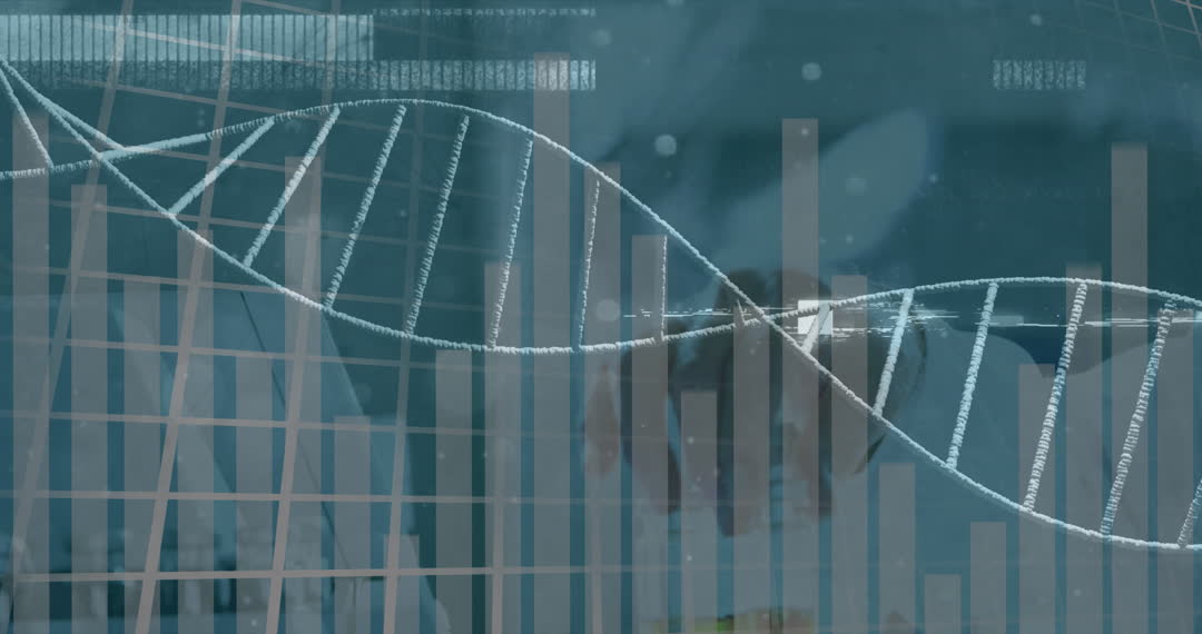 This video portrays a Caucasian scientist surrounded by advanced digital elements, exploring a DNA strand with bar charts overlay. It fits biotechnology research themes and can illustrate breakthroughs in genetics on educational platforms, science related presentations, or articles discussing molecular technology.