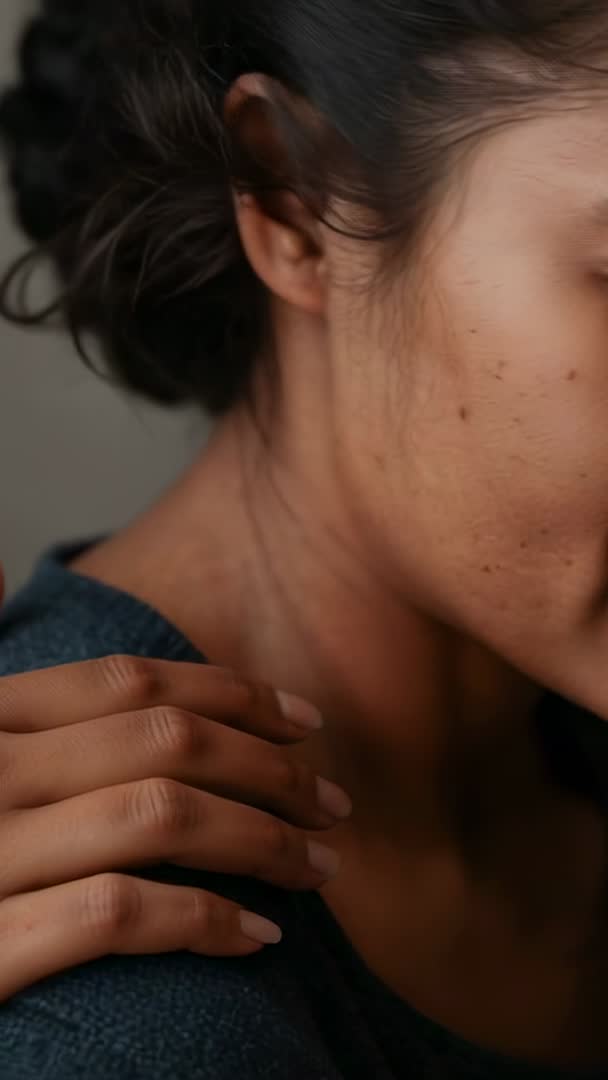 AI Generated Video. Showing intimate closeup of woman placing left hand on shoulder while turning head to reveal profile and neckline. Soft warm lighting highlighting skin texture, subtle freckles, and natural nails. Vertical 9:16 framing optimized for mobile-first platforms, social media reels, and stories. Working well for beauty and skincare campaigns, wellness and self care storytelling, fashion lookbooks, mental health awareness content, editorial cutaways, and lifestyle vlogs. Tips for editors: pair with quiet ambient music, add gentle voiceover or captions, leave negative space for titles, crop for thumbnails, and apply warm neutral color grade to enhance mood.