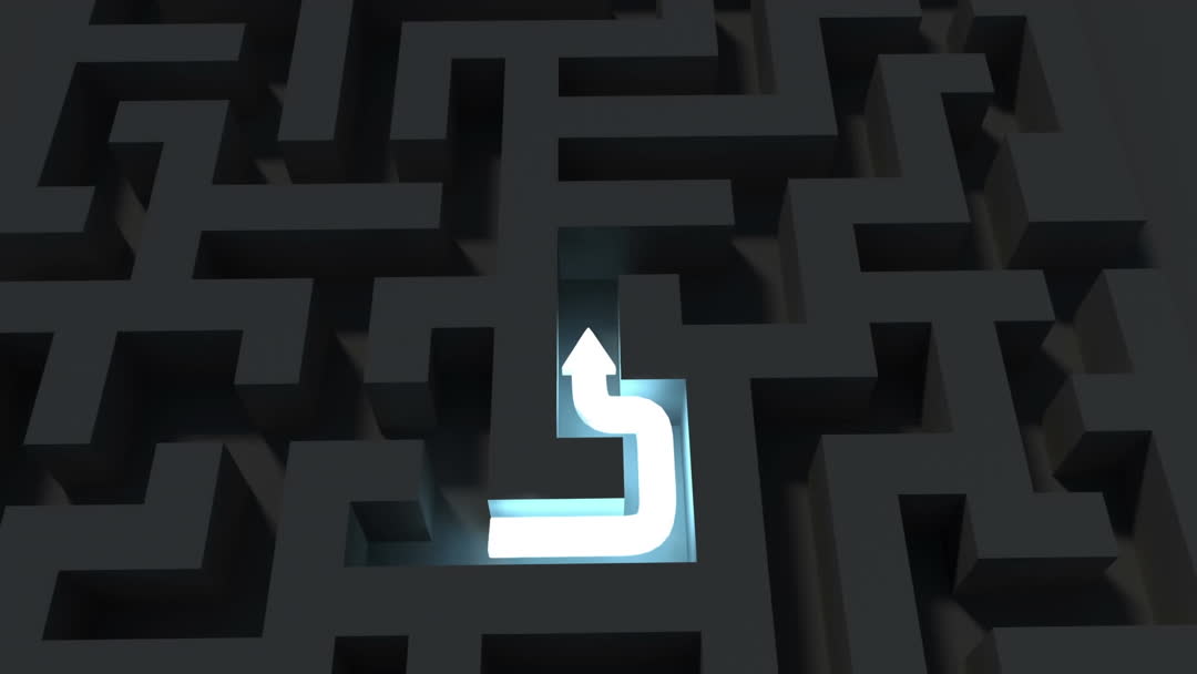 Depiction of an arrow inside a dark black maze highlighting overcoming challenges and finding solutions. Suitable for illustrating concepts related to decision-making, business strategy, wayfinding, and overcoming obstacles. Ideal for use in presentations, websites, and educational materials emphasizing problem-solving and strategic thinking.