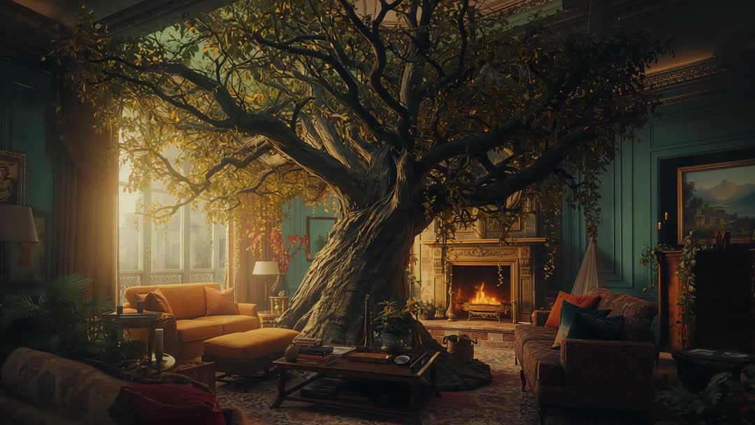 AI Generated Video. A stunning video capture features a grand tree growing in the middle of an opulent living room, bathed in warm lighting from a crackling fireplace. The video combines elements of nature and luxurious interior design, highlighting tranquility and elegance. Rich furnishings and ornate decorations surround the tree's base. Ideal for themes related to luxury living, interior design balance with nature, and creating unique environments.