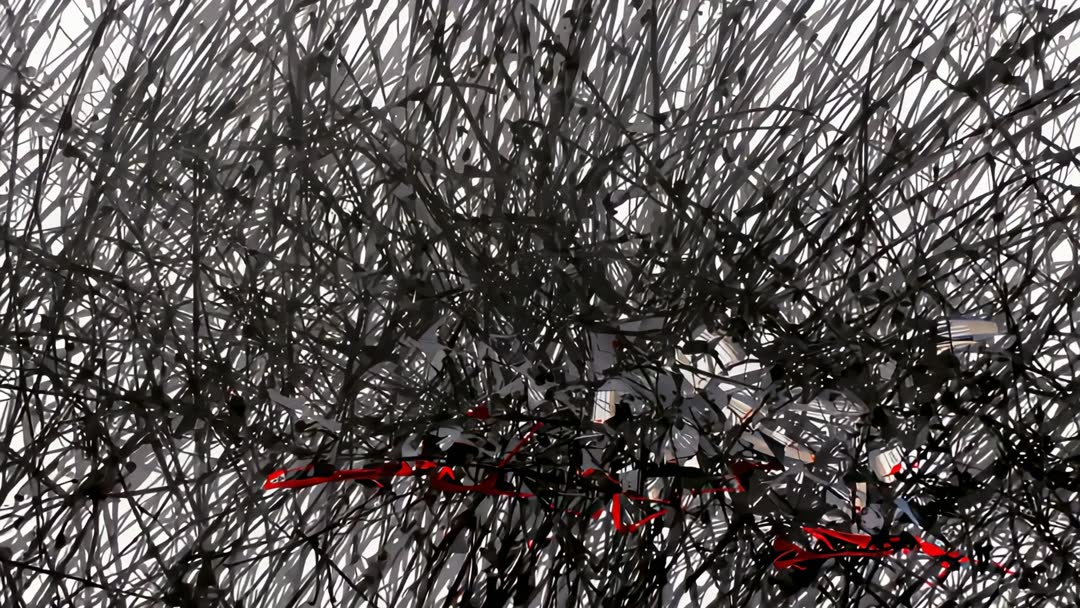 AI Generated Image. Digital art showcasing dense overlay of black lines creating intricate web-like illusion over white backdrop. Hints of red and gray within core, adding dynamic visual focus. Useful for tech, design inspirations, modern branding videos, and promotional content.
