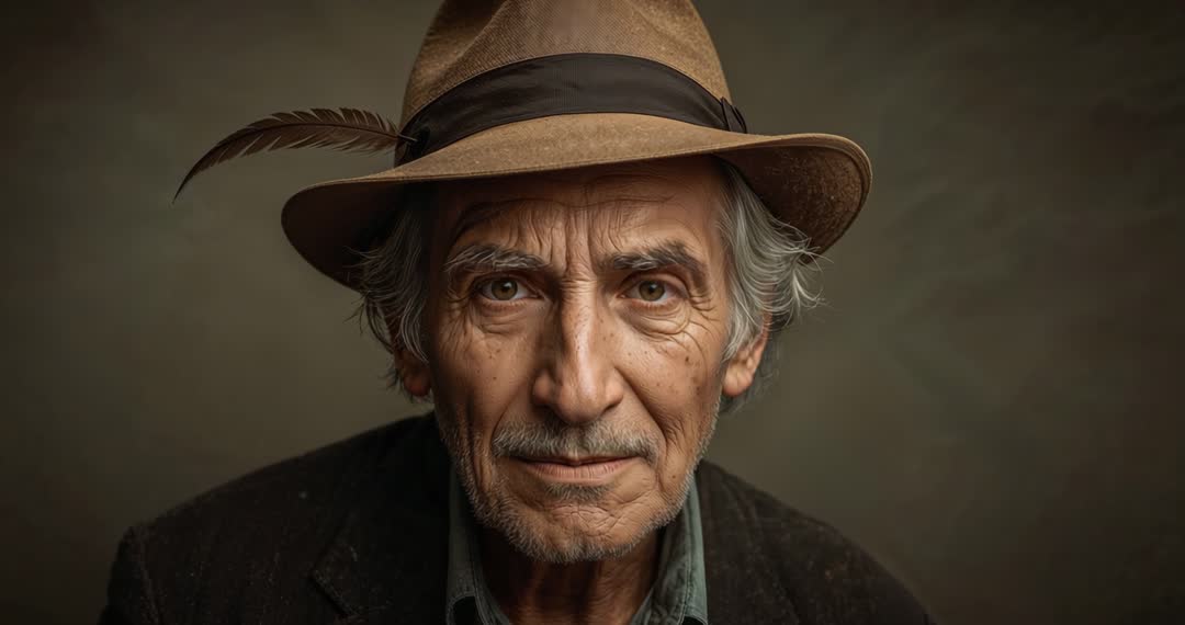 AI Generated Image. This video captures an elder male wearing a fedora hat, transitioning from a calm demeanor to a confident gaze in a studio setting. Displaying maturity and sophistication, he embodies wisdom and introspection, charming viewers with nuance and depth. Perfect for campaigns emphasizing life experience, elegance, storytelling videory, or content aimed at celebrating age and wisdom.