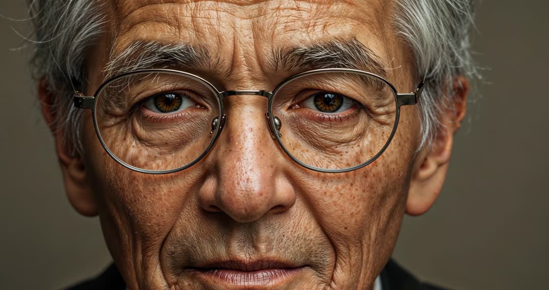 AI Generated Image. This video captures a senior Asian man wearing glasses, maintaining a thoughtful and neutral expression. His mature features are highlighted by a dark jacket, against a simple brown backdrop. This high-resolution portrait is suitable for projects focusing on themes of wisdom, introspection, elegance, and professionalism. It can be used in magazines, advertisements, or online platforms to emphasize maturity and experience.