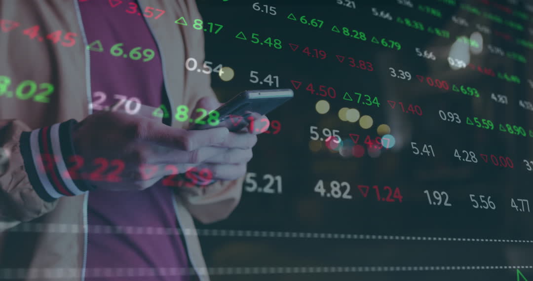 Image depicting a person using a smartphone with stock market data overlay, suitable for illustrating articles about investing, finance apps, or digital trading tools. Useful in marketing financial services or data analysis applications, highlighting technological aspects of online investing or business analytics.
