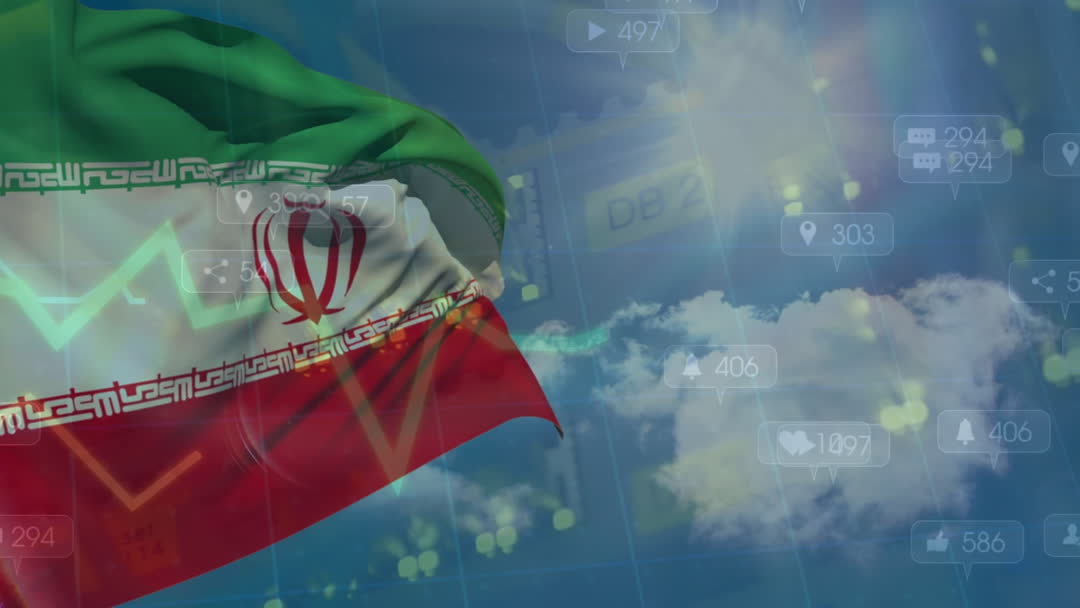 Videos features waving Iran flag with digital elements depicting social media notifications and medical icons, combined with presence of soldiers. Represents intersection of national presence, health, and digital communications during a pandemic. Ideal for use in discussions about COVID-19 in Iran, global pandemics, healthcare challenges, and impact of technology on public affairs.