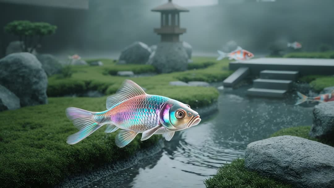 - Iridescent Koi Fish Gliding Transition Across Peaceful Zen Pond