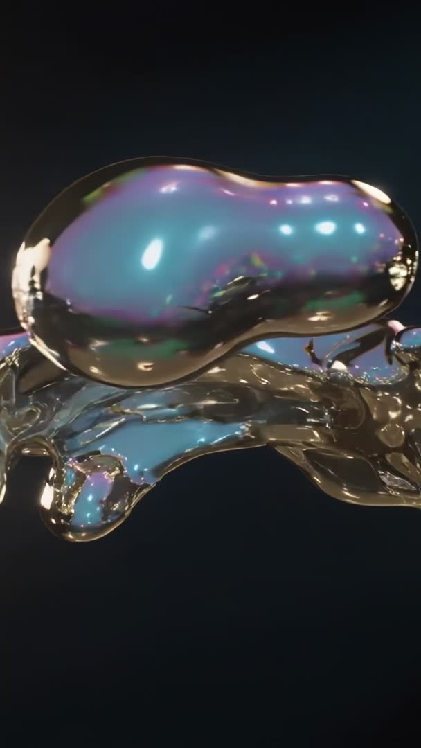 AI Generated Image. Shifting iridescent liquid metal blob stretching into delicate filaments and shedding spherical droplets against deep black void. High-contrast reflective surfaces catching multicolor highlights, creating futuristic abstract motion loop. Suiting tech brand intros, product launch backgrounds, motion graphics loops for social media stories, music visualizers, device wallpapers, exhibition displays. Rendering with photoreal metallic shader and smooth slow-motion blur, offering loopable vertical clip optimized for mobile screens. Serving creative projects needing surreal fluid dynamics, glossy textures, and modern experimental visuals.