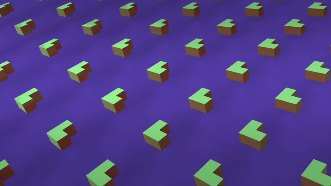 Graphic shows a repetitive isometric grid of green blocks on a purple surface, symbolizing digital connections and data networks. Ideal for technology blogs, science presentations, or digital network studies as eye-catching visual element representing data flow and interconnectedness in modern computing systems.