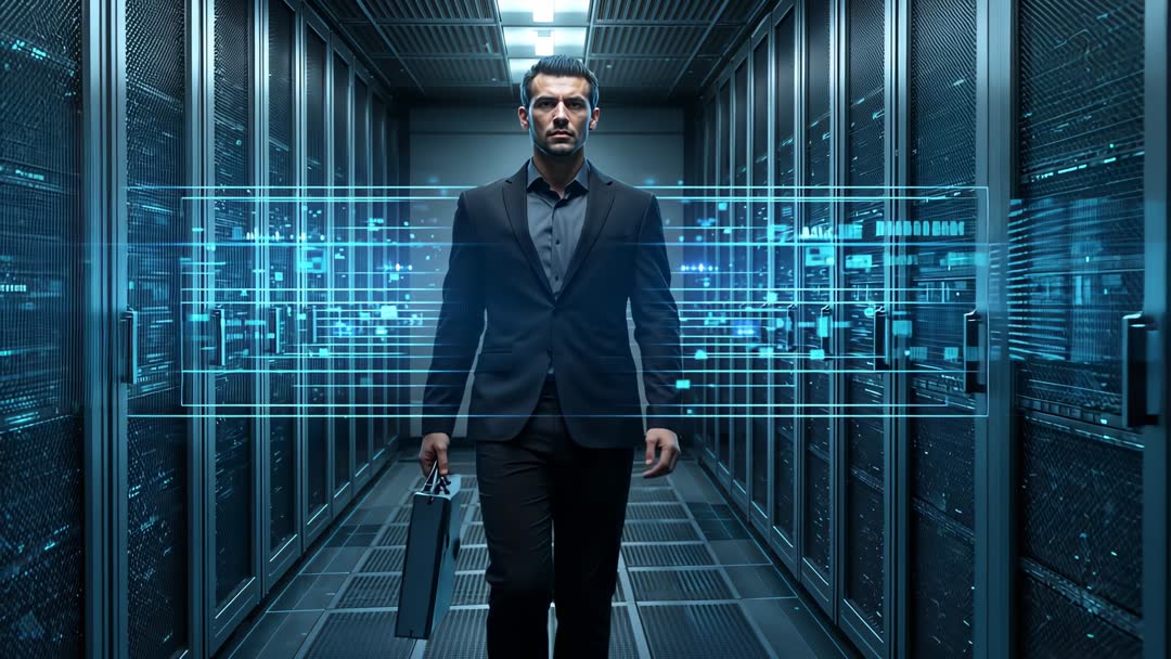 AI Generated Image. Cinematic video showing IT executive walking down server aisle while activating holographic HUD overlay. Blue-toned lighting emphasizing high-tech atmosphere and depth. Camera tracking shot following executive center, briefcase in hand, rack LEDs pulsing. Visuals combining live-action footage with digital UI graphics for futuristic tech narrative. Clip working well for technology marketing, cybersecurity presentations, cloud services demos, enterprise infrastructure showcases, and corporate recruitment films. Also useful for website hero banners, investor pitch decks, product launch videos, trade show displays, and social media promos. Editing options include cutting to close-ups on HUD elements, slow-motion walk cycles, rack pan transitions, and lower-third overlays. Color grading recommending teal-blue palette to enhance futuristic mood. Ensure model release when using recognizable person for commercial endorsement and verify server access permissions for branded content.