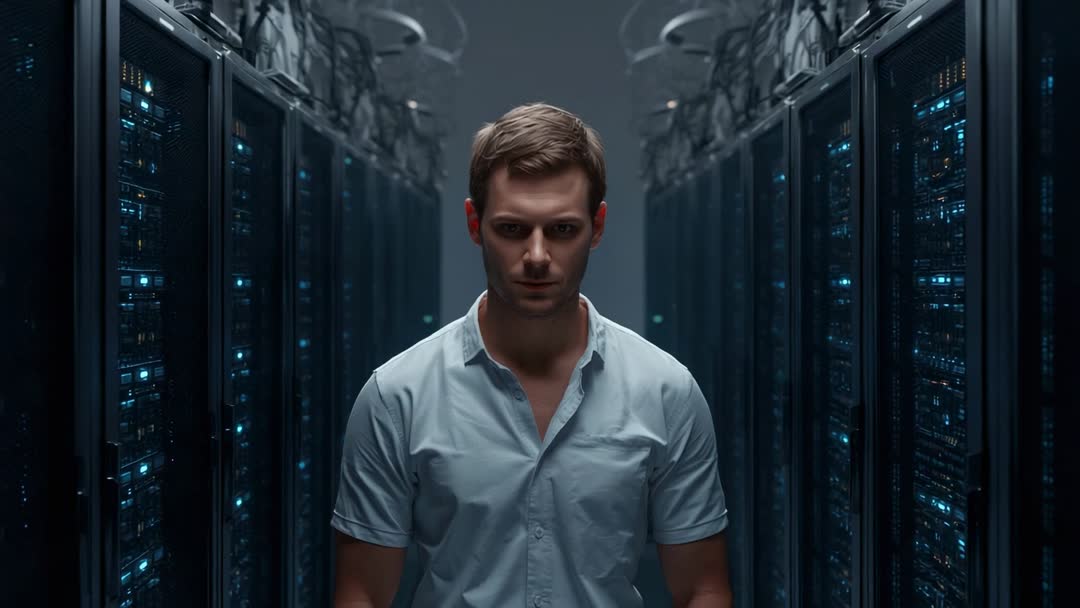 - IT Professional Walking Through Futuristic Data Center Corridor