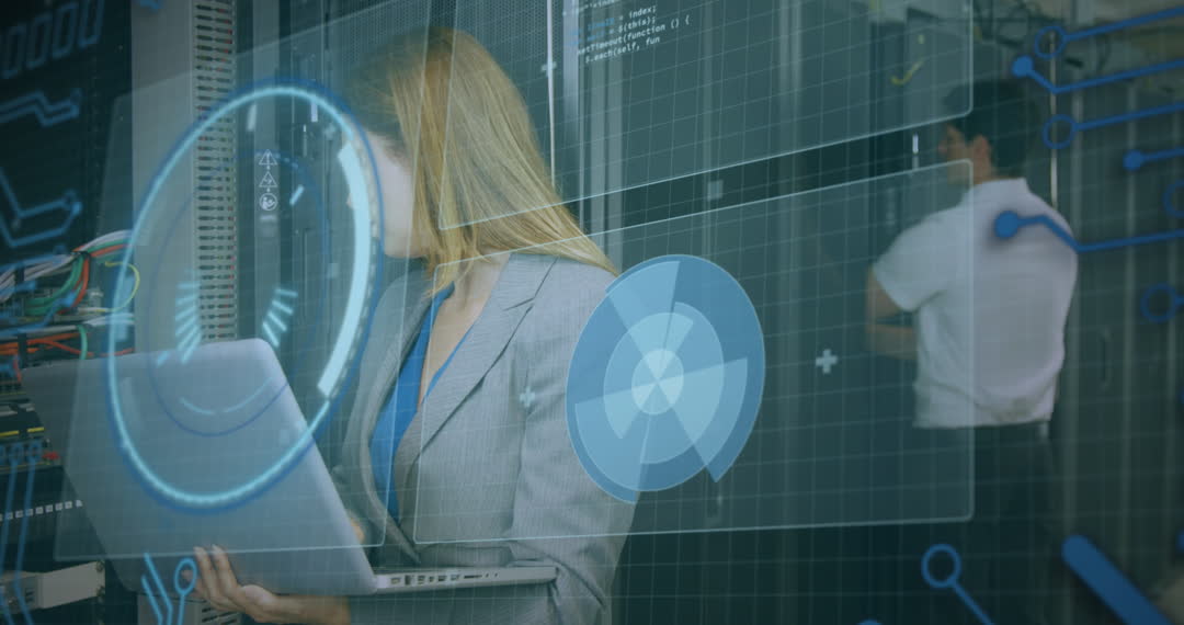 Image depicts professionals working within a high-tech computer server environment, showcasing intricate digital graphics and interfaces. Ideal for illustrating themes of cybersecurity, IT support, networking technologies, and corporate data management in tech industry presentations, articles, and promotional materials.