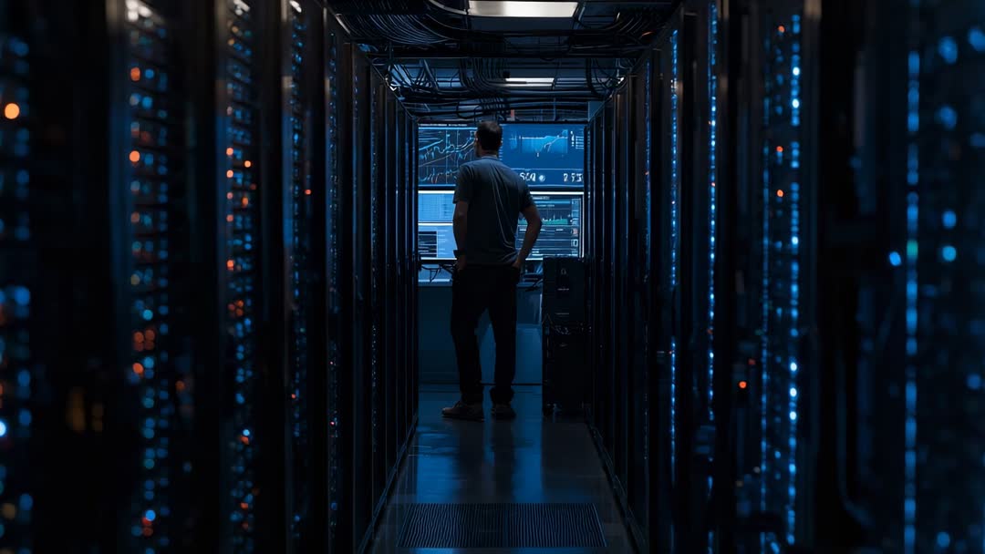 AI Generated Video. An IT technician is standing in a corridor of server racks, analyzing digital information displayed on multiple screens inside a modern data center. The tech environment is filled with the glow of electronic displays and hardware lights, reflecting a high-tech workplace focusing on cybersecurity and data management. This image is suitable for illustrating cybersecurity solutions, corporate IT services, data center management, and presentations on digital innovations or technological infrastructure efficiency.