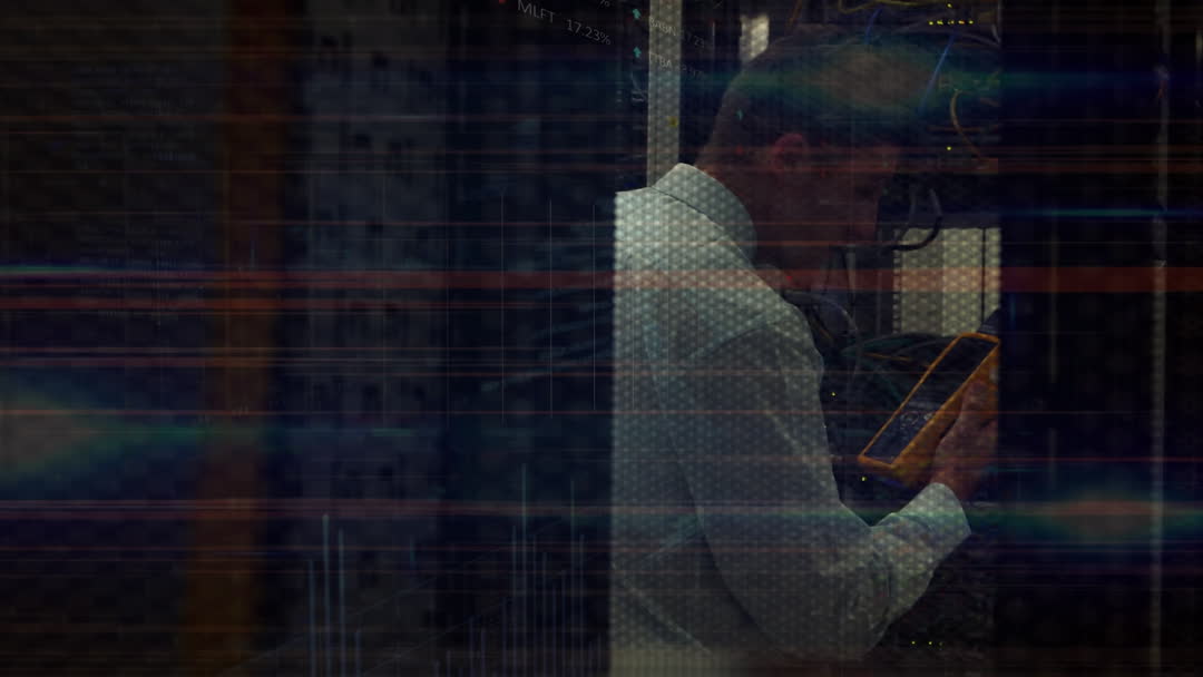 IT Technician Analyzing Data in Server Room with Digital Overlay Video