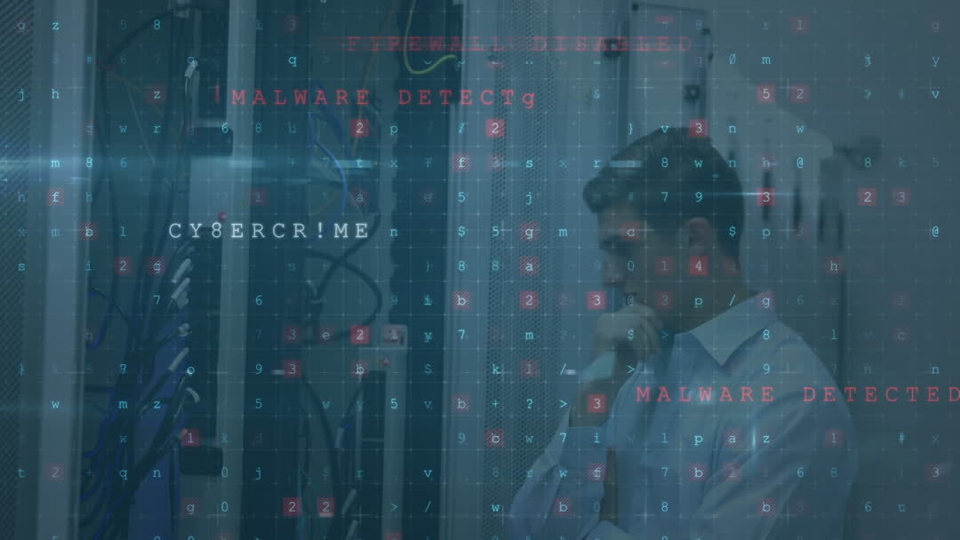 Caucasian male technician is standing in a server room, analyzing data and cyber security threats with digital overlay. Concepts include cybersecurity, data protection, technology management. Useful for illustrating digital security threats, cybersecurity services, and IT infrastructure protection.