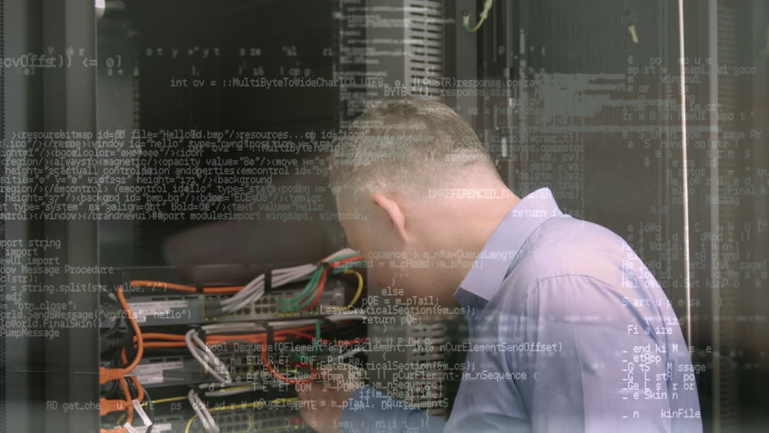 An IT technician is managing a server rack, with lines of code symbolizing data processing overlaid. This visual is ideal for illustrating concepts of back-end technology, data infrastructure management, or internet connectivity. It can be used in marketing materials for tech companies or educational presentations about computer networks and system administration.