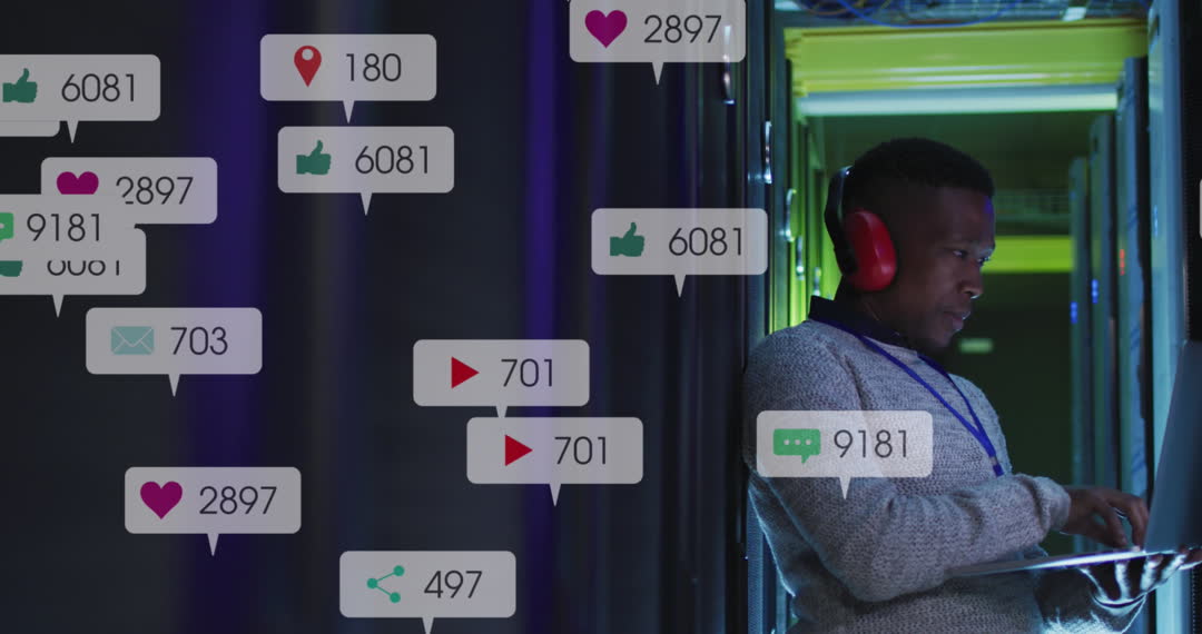 An IT technician using laptop beside computer servers while social media notification icons and numbers are animated around him. This suggests monitoring of social media data and highlights technological communication and digital possibilities. Suitable for themes of IT, data processing, social media analytics, and digital teamwork. Use in articles and presentations discussing technology and online interaction advancements.