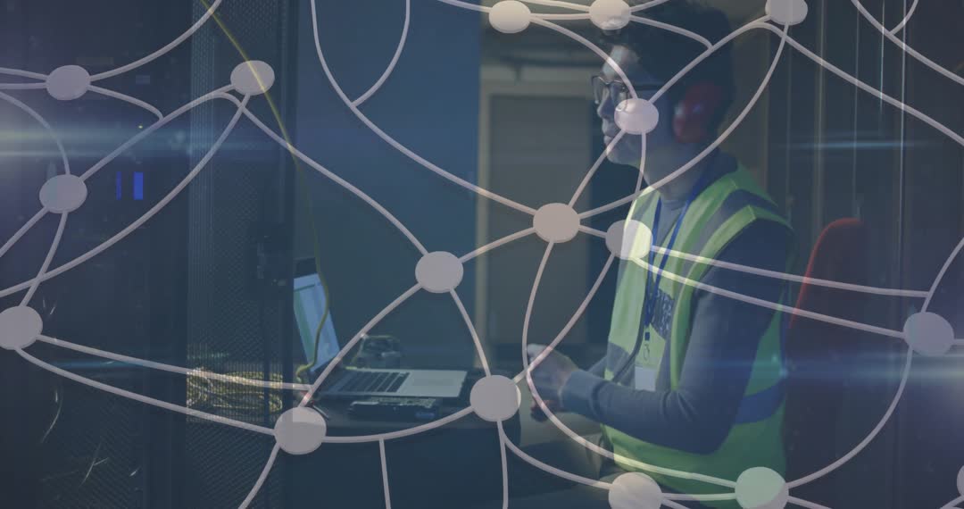 Technician wearing headphones working at laptop in data center with overlay of network graphics, illustrating digital connectivity and cybersecurity. Useful for articles and content focused on data center operations, IT security, digital network infrastructure, or technology how-tos.