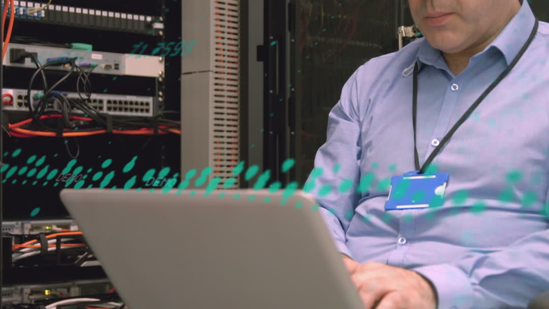 This scene presents an IT technician using a laptop amidst rows of servers. Digital animation overlaid resembles data transfer and networking activities. Suitable for illustrating themes like cybersecurity, network maintenance, IT infrastructure, or technology operations in articles, business presentations, or educational materials about information technology and database management.