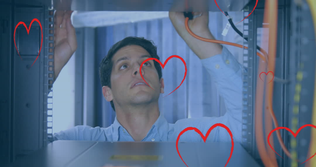 Image shows IT technician managing network cables in data cabinet, symbolizing dedication and love for technology through superimposed heart shapes. Useful for illustrating technology passion, server maintenance, and IT professional commitment in diverse settings. Ideal for promoting IT company services, illustrating tech dedication and creativity in marketing materials, blogs, or educational content.