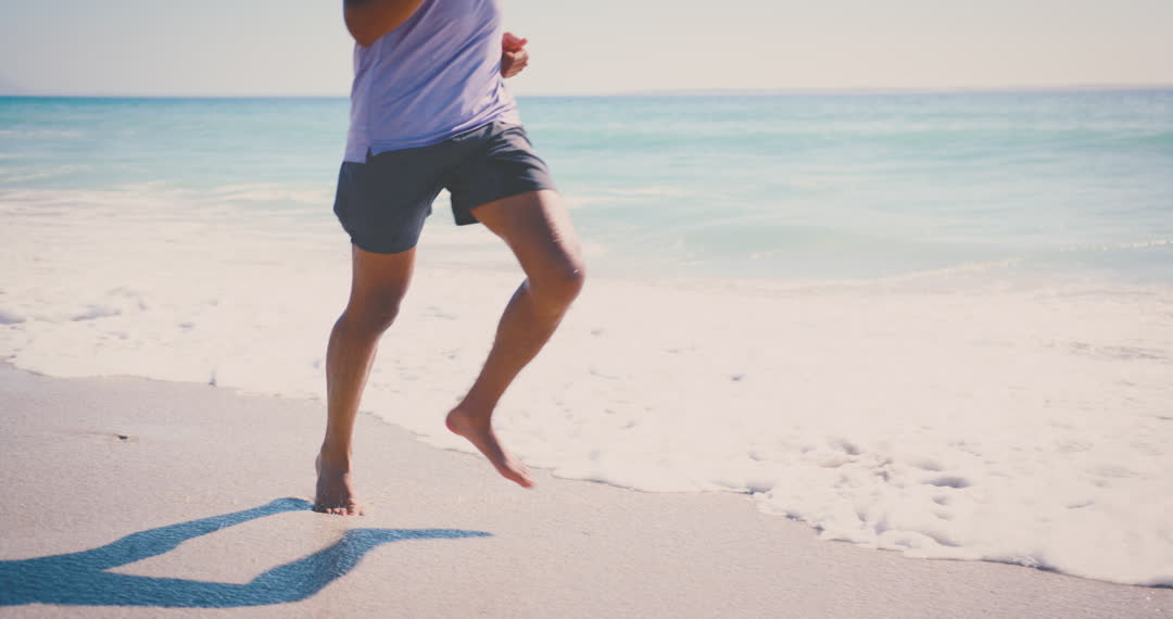 Depicting an individual running barefoot along a sandy beach with waves, this visual focuses on fitness under a sunny sky. Suited for marketing health and wellness products, activewear, vacation destinations or in inspirational content encouraging physical activity and outdoor enthusiasts.