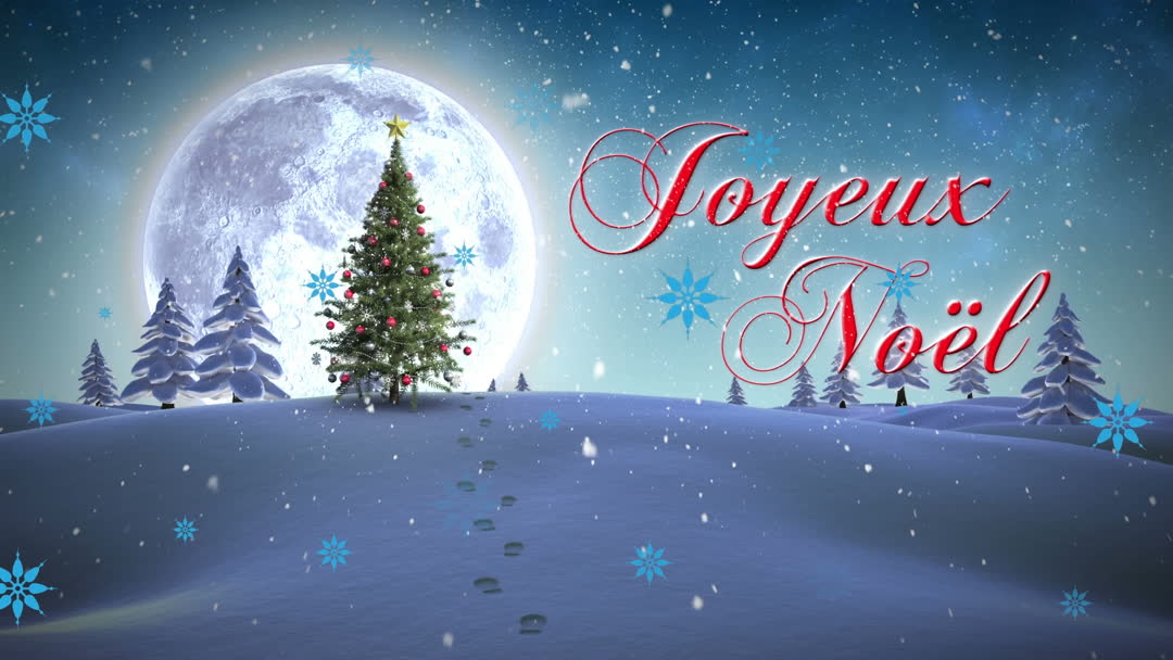 A serene winter scene featuring a beautifully decorated Christmas tree under a bright full moon with the words 'Joyeux Noël' in elegant script gently overlaying the video. Surrounded by gently falling snowflakes, this magical setting creates a tranquil and festive atmosphere. Ideal for greeting cards, holiday digital content, and festive season marketing materials conveying warmth, nostalgia, and celebration.