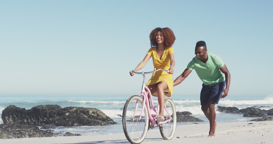A joyful scene featuring an African American couple enjoying their vacation on a tropical beach. The woman is riding a bike, while the man is running behind her, pushing and laughing. This captures a moment of playful activity and happiness by the coastline. This vibrant video is perfect for use in advertisements or articles about vacation travel, outdoor adventures, beach activities, young couples, and healthy lifestyle inspiration.