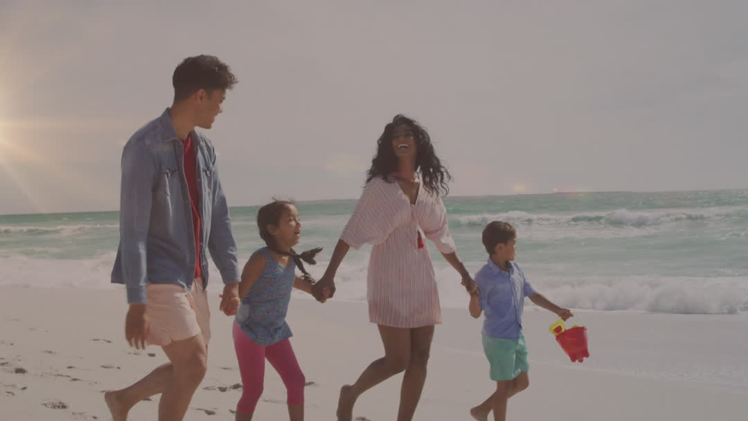 A biracial family, with two adults and two children, are walking happily along a sunny beach with light trails animation surrounding them. Ideal for themes of family bonding, vacations, diversity, and outdoor activities promoting unity and happiness.