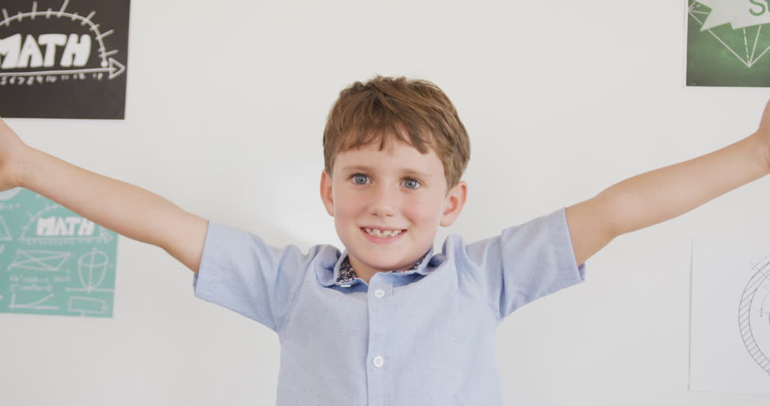 A young caucasian boy is expressing happiness with his arms wide open, standing in a bright classroom. Educational posters are visible in the background, emphasizing math. This video is perfect for use in educational materials, school promotional content, or child development programs, highlighting positivity and student success in a learning environment.