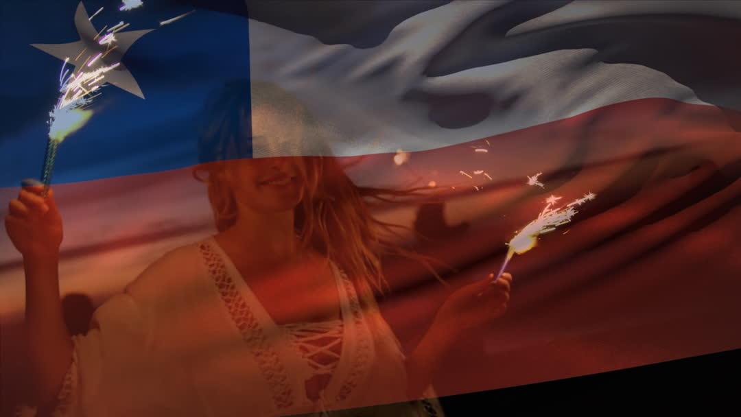 Double exposure of joyful individuals at beach holding sparklers overlayed with waving Chile flag evokes spirit of freedom and patriotism. Ideal for content related to Chilean national holidays, cultural celebrations, travel to Chile, or promotional materials encouraging tourism and community gatherings.
