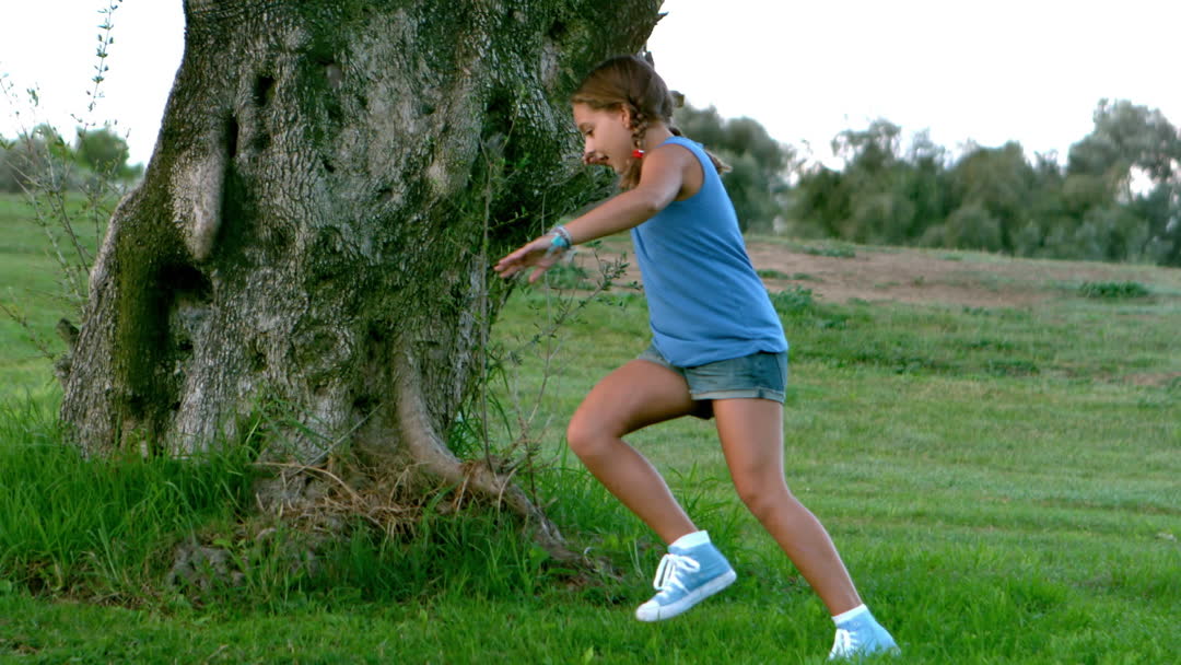 A young child enjoys running around a large tree in a sunny park, capturing the essence of playful childhood and exploration. Ideal for depicting themes of outdoor activities, family, and nature play, this can be used in children’s lifestyle and educational content or promoting parks and recreational equipment.