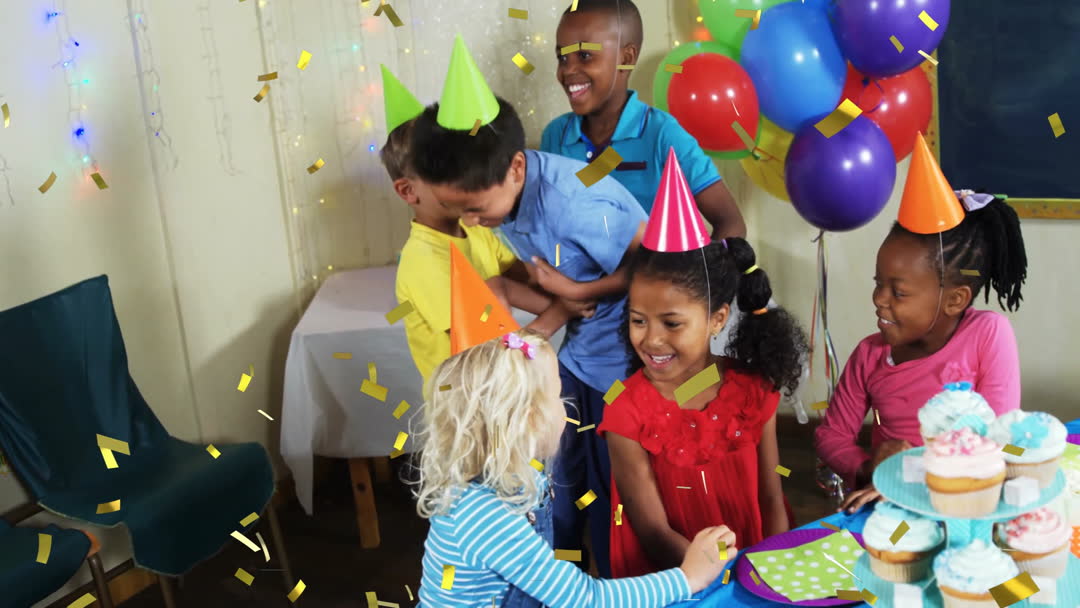 A group of children celebrating a birthday party, adorned with party hats, and throwing gold confetti into the air. Bright balloons and decorated cupcakes add to the festive atmosphere. This scene is perfect for illustrating youthful joy, communal fun times, and celebratory events. Ideal for use in content related to family gatherings, party event planning, and children's entertainment marketing materials.