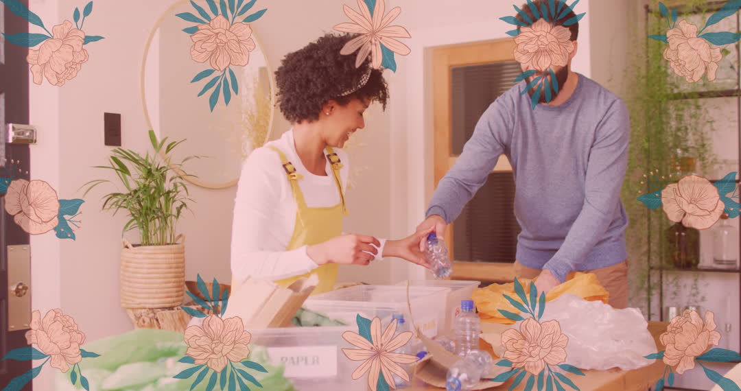 This visual captures a diverse couple joyfully engaged in an eco-friendly activity at home, enhanced by a whimsical animation of flowers. It portrays themes of love, sustainability, and partnership, suitable for use in content promoting environmental awareness, relationship building, or lifestyle blogs focusing on sustainable living practices.