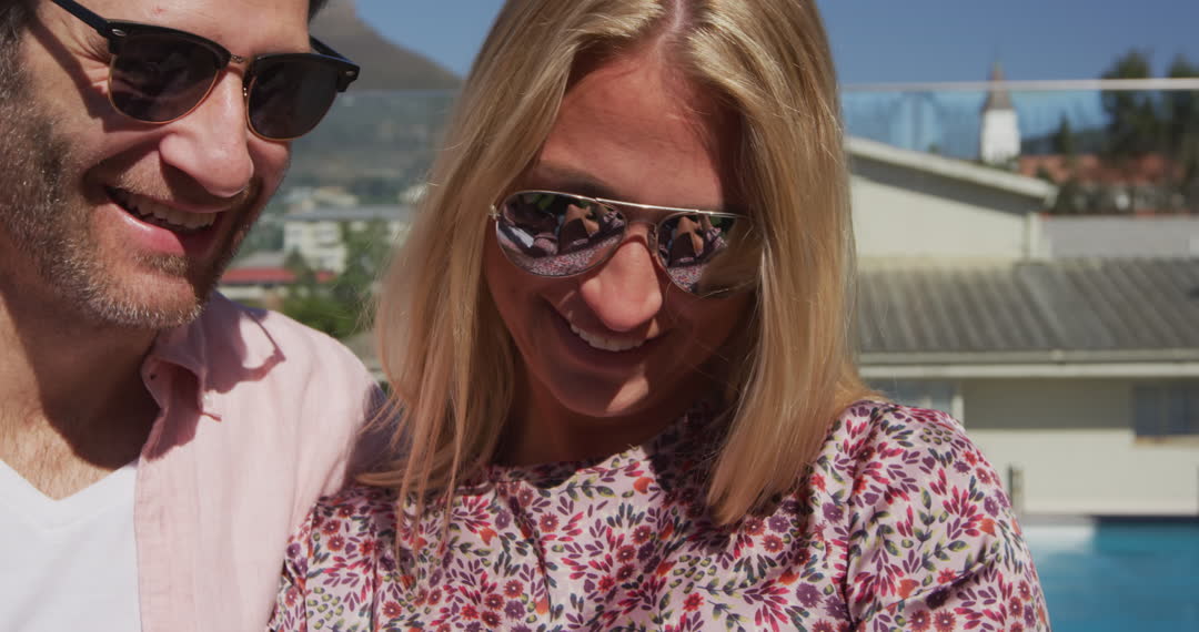 - Joyful Couple Relaxing by Poolside with Smartphone in Sunny Summer
