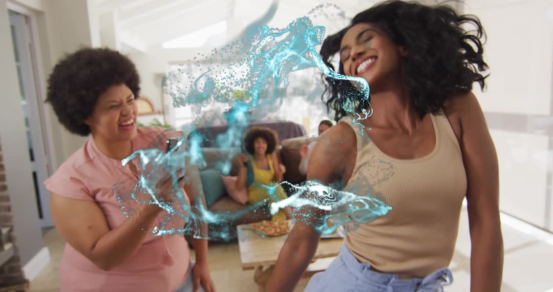 This scene captures a moment of celebration and joy as a family member films their daughter dancing, creating a visually captivating holographic swirl with a smartphone. The use gives a glimpse into innovative technology and family gaming or entertainment applications. Ideal for illustrating advanced tech in play, encouraging products targeting family-friendly fun or lifestyle and wellness promotions. Benefits advertising campaigns related to interactive technology or bonding moments through tech.