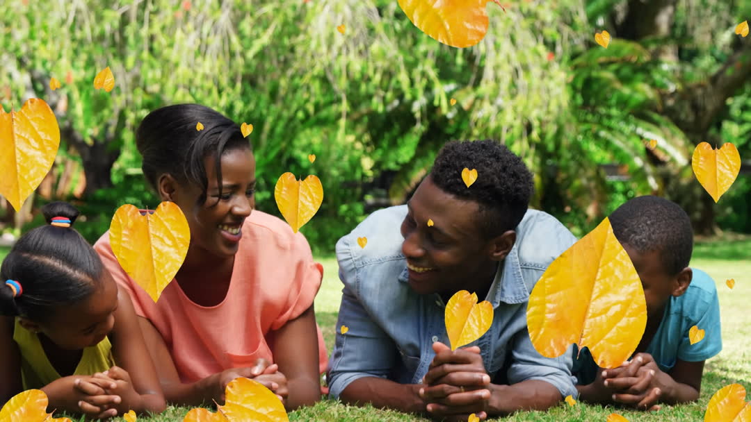 Family members are lying on grass, lovingly enjoying each other's company as animated yellow leaves fall around them. The lush green surroundings provide a serene ambiance, perfect for promoting themes of family, connection, and outdoor fun. Use for family-focused content or advertisements centered on togetherness and seasonal change.