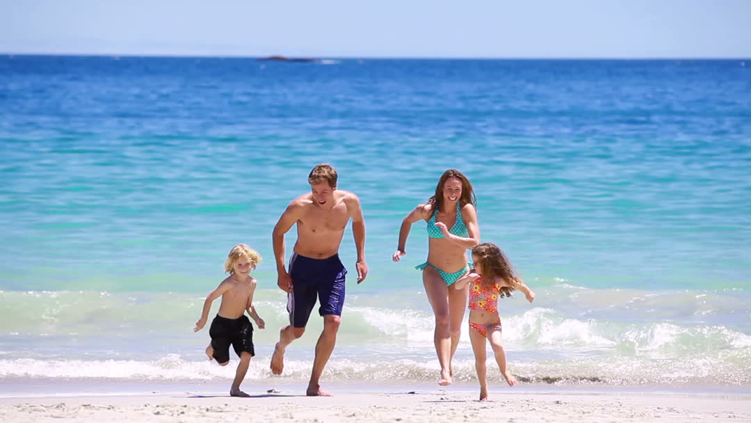 Family of four enjoying a sunny day at the beach, running together on the sand with ocean waves in the background. Perfect for depicting family vacations, beach trips, and outdoor fun. Ideal for use in travel brochures, tourism websites, and family lifestyle promotions.