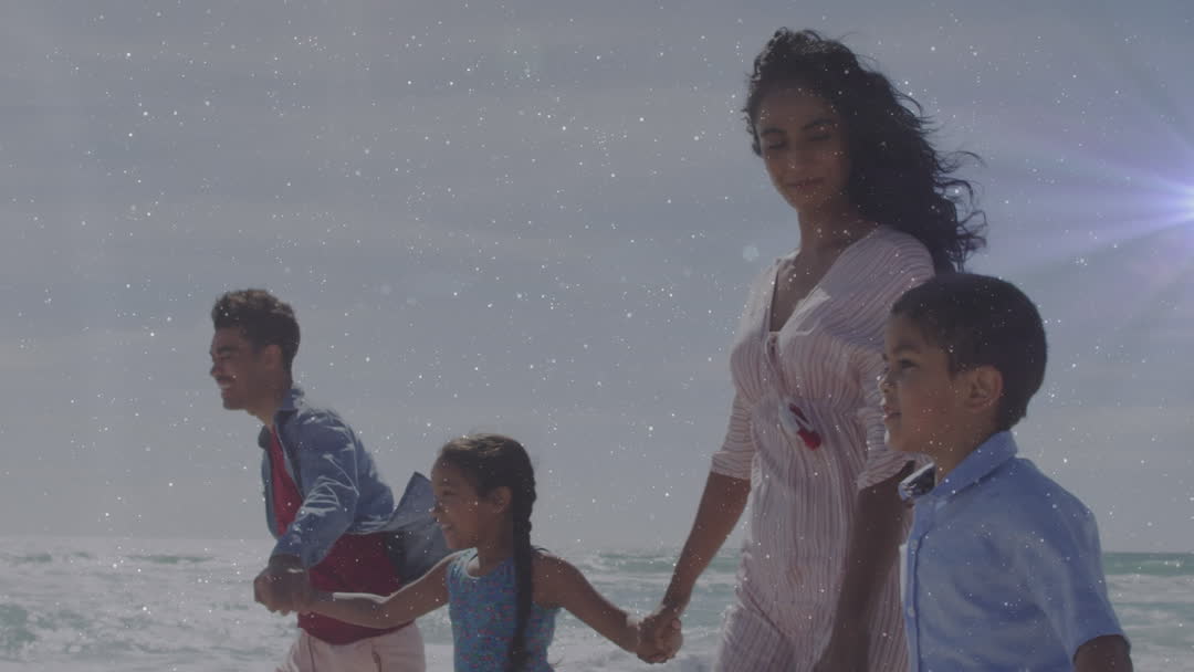 A smiling biracial family of four enjoys a leisurely walk along the beach under the bright sunlight. The light sparkles around them create a whimsical atmosphere, suggesting moments of bonding and happiness. Perfect for advertisements focusing on family vacations, diversity, lifestyle blogs, and content celebrating togetherness and joy in everyday moments.
