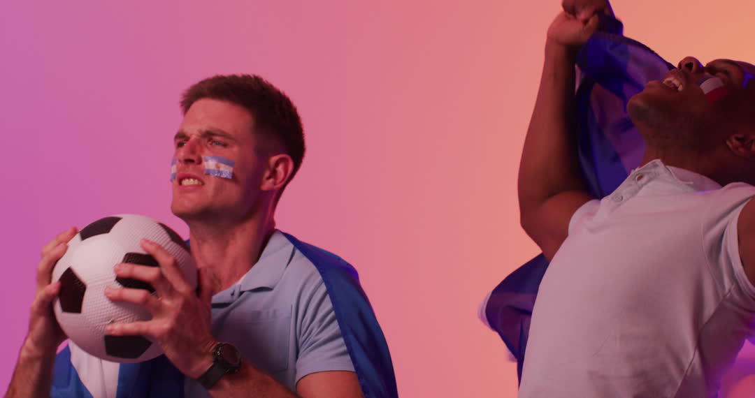 Two male football supporters, adorned with national flags, express excitement and joy while holding a soccer ball. Set against a vibrant pink and orange backdrop, the video captures the exhilarated spirit of sports fans celebrating a victory or exciting game moment. Ideal for illustrating sports enthusiasm, diversity in sports fandom, and patriotic celebrations. Useful for articles, blogs, and campaigns focused on sports events, fan experiences, or identity.