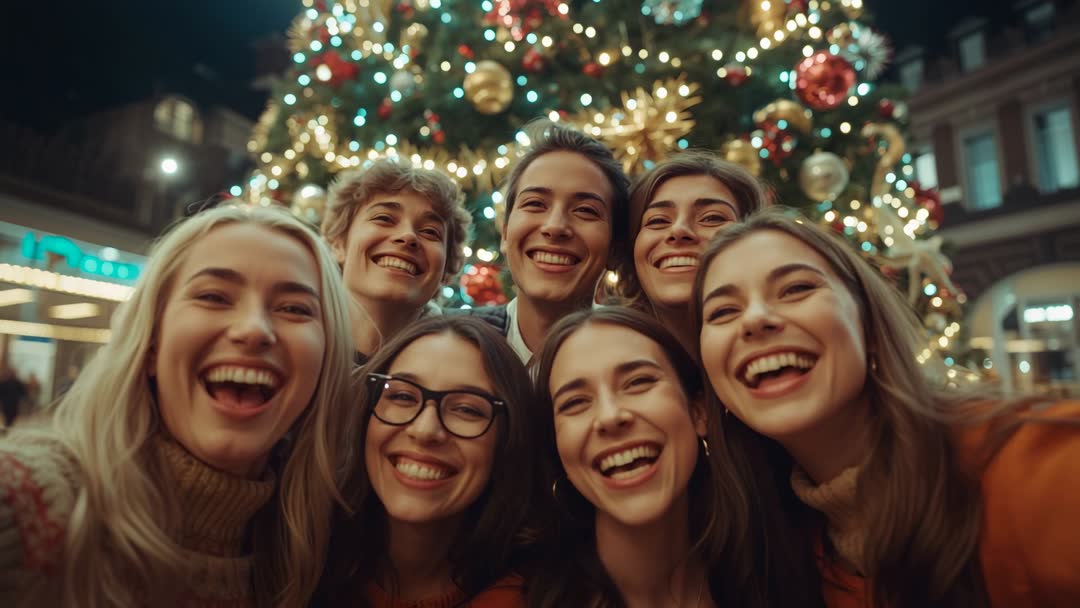 AI Generated Video. Group of friends joyously capturing a selfie beneath brilliantly lit Christmas tree. Ideal for themes of holiday celebrations, togetherness, and festive spirit. Perfect for marketing campaigns promoting seasonal products, party invitations, or season's greetings content. Embodies spirit of joy, friendships, and holiday festivities, prized in promotions centered on celebrations, night events, and youthful exuberance.