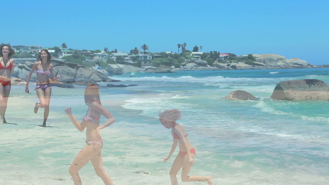 Young women enjoying playful moments while running along a scenic beach. Ideal for themes related to friendship, carefree lifestyles, summer vacations, or outdoor activities, this scene captures the lively spirit of the seaside environment and can enhance promotional materials for travel agencies, social media invitations, or lifestyle blogs.