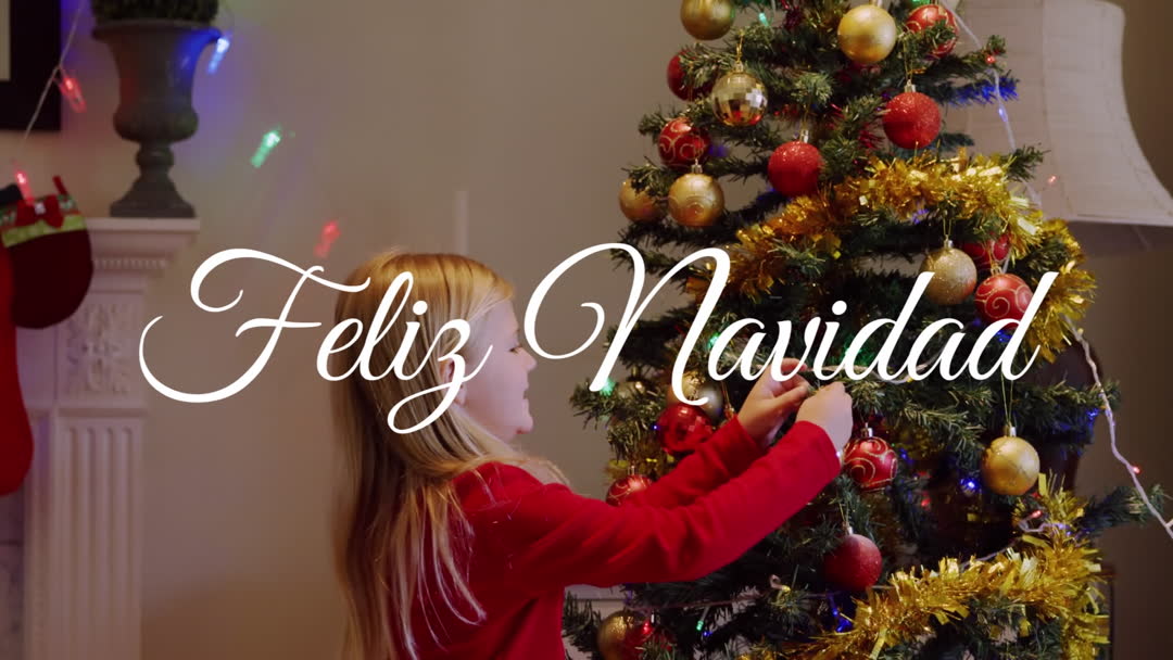 A young girl joyfully decorates a Christmas tree with ornaments and wears a red sweater. The scene captures the warmth and festivity of holiday celebrations with a clear 'Feliz Navidad' message overlay. Ideal for holiday greeting cards, festive family promotions, or home decor inspiration during the holiday season.